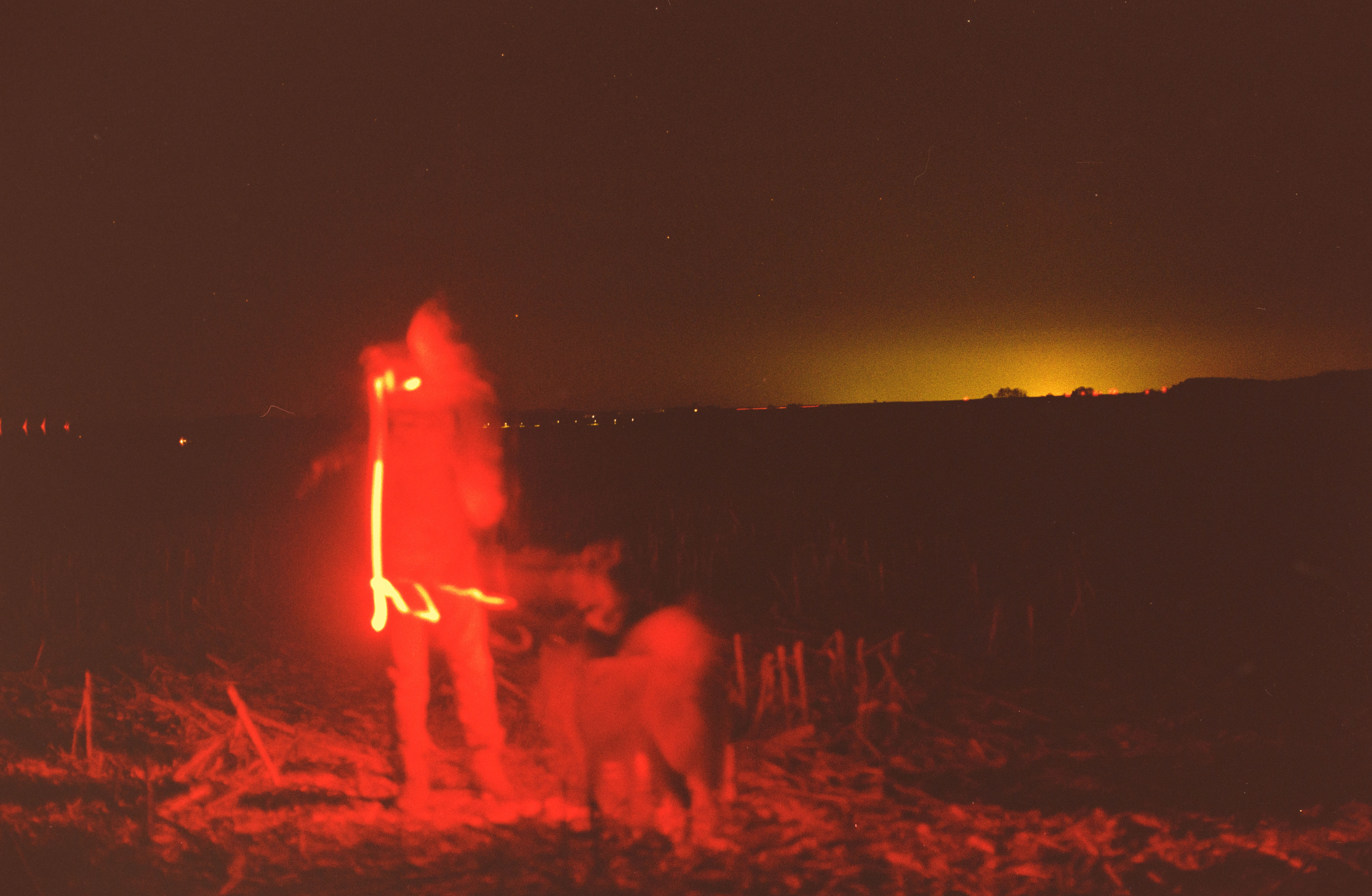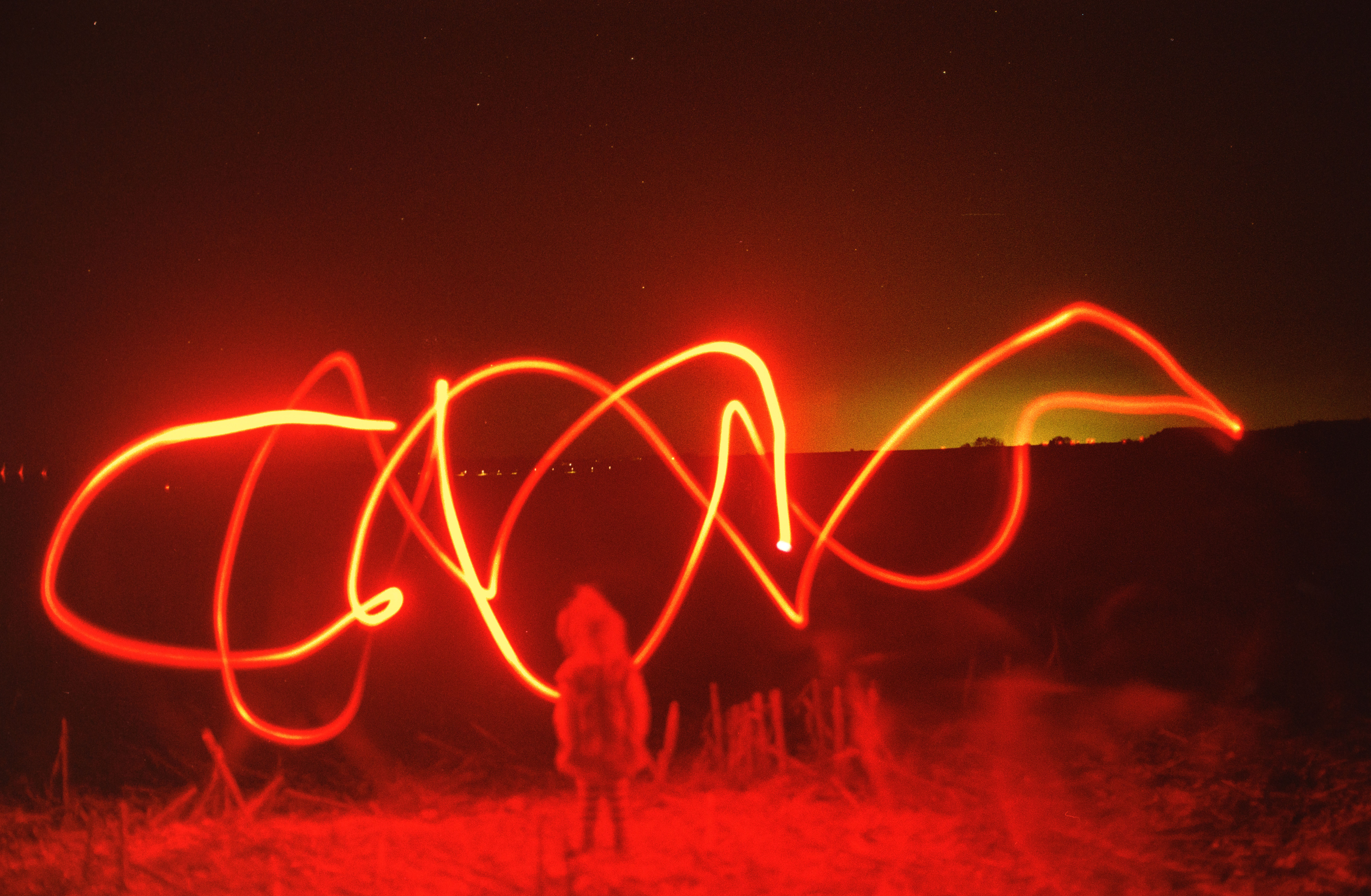 Ein kleiner Mensch, ein Tier und ich haben irgendwann einmal an den Belichtungszeiten meiner Kamera rumgefummelt. Zufällig war es dunkel und ich hatte eine Stirnlampe dabei. Herausgekommen sind diese Aufnahmen.